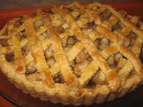 Roll out the second half of the dough and cut into narrow strips. Put apple filling into tart crust and dot with 2 tablespoons of butter (tiny little dots). Lay the crust strips over the apples. Brush the strips with egg wash (1 egg beaten with a little water). Sprinkle strips with a light dusting of white sugar.