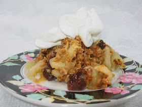 Hoping to find an idea, I started looking through the pantry when it hit me; I love dipping apples in peanut butter and better yet dipping apples in peanut butter mixed with honey…bingo! Here is my new recipe for Apple and Peanut Butter (with honey) Crisp, it was a big hit with hubby. The apples are mildly sweet and the raisins are plump and juicy. The crunchy topping has a hint of peanut butter...just right!