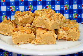 Pour this mixture over the peanuts in the pan and spread out evenly. Sprinkle the other half of the peanuts over the hot mixture and press the nuts into the surface of the hot mixture (with your hand). Chill in the fridge for 1-2 hours or until firm. Cut into pieces and serve. Store covered in fridge. Makes 60 pieces of candy.