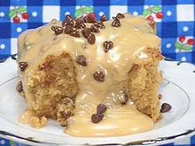 Warm the peanut butter and honey in the microwave just until it gets soft and easy to stir, then add everything else and beat until smooth. Spread over hot cake and sprinkle with one cup of mini-chocolate chips.