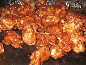 Return to heat and mix sauce thoroughly. When it is bubbly, put the chicken in the sauce and stir to coat all of the pieces (I use a wide flat spatula to turn the pieces in the sauce).
