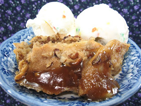 Let baked dessert sit for at least 30 minutes before you serve. When it first comes out of the oven, the apple filling will appear to be thin. However, as it cools, the sauce in the filling will thicken considerably. Serve warm (or room temperature) with ice cream (with no sprinkles).