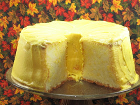Bake in a 325 oven (bottom rack of oven) for 60 to 65 minutes or until the top springs back when touched lightly (my oven took 65 minutes). Remove from oven and turn pan upside down like you would for an angel food cake. Cool completely.