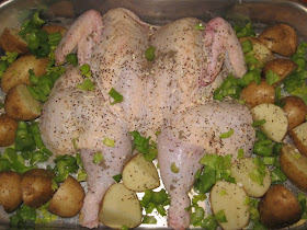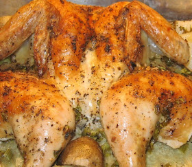 Once the backbone is removed, rinse the chicken thoroughly in running cold water, rubbing down all parts of the meat (see note); dry with paper towels. Because you will want this chicken to lay out flat in the roasting pan, crack (or cut) the breastbone but don't cut down into the meat. Once you crack the breastbone, you should be able to open the chicken and lay it down flat in a roasting pan like this: