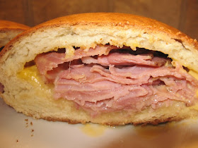 Originally, this is a dough that my German Russian ancestors used for a hot and savory ham and sauerkraut sandwich. I decided to experiment with various fillings and they have been such a big hit with Hubby that I've made them twice this week. I've made calzones for years, but these are so much better...not bready or doughy at all and the dough raises just enough (as it bakes) to make the perfect sandwich...light, crispy and delicious.