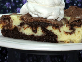 It is a flourless chocolate and vanilla marble "cake" and it was absolutely delicious, although I don't know if I would really classify it as a cake. It tasted very much like a fudgy cheesecake. I will definitely be making this again.