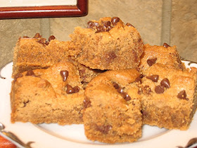 Cream the peanut butter and butter together; beat in the sugars, eggs and vanilla until well combined. Mix in the flour, baking powder and salt until well mixed, then fold in the miniature chocolate chips. Spread into a 9" x 9" greased baking dish.