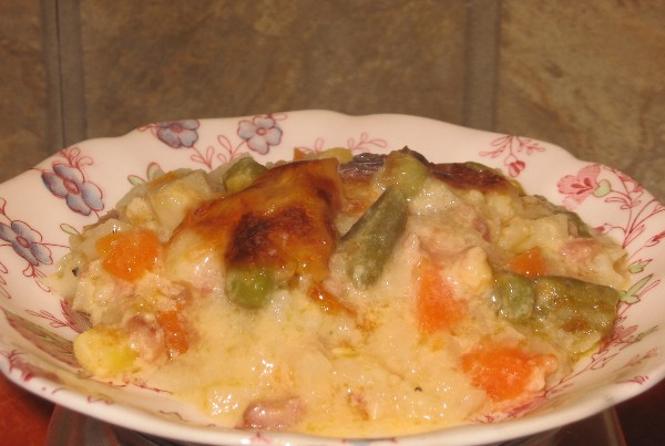 Slice or dice the potatoes and carrots about the same size. Add 2 cups of your favorite veggies. In a pinch I use frozen mixed veggies, but in the summer, I like to use fresh veggies.