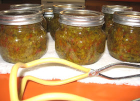 Also, while the relish is simmering, bring your hot water bath to a boil, here's how: Place a rack on the bottom of a large stock pot (or something to keep the jars up off of the bottom of the pan) and fill the pot with water (water should be deep enough to cover the jars by 2". Bring to full boil.